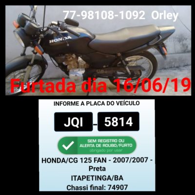 A motocicleta Honda CG 125 FAN, ano 2007, cor preta, licendiada em Itapetinga, foi furtada nas proximidades da Igrejinha de Pedra, onde foi deixada estacionada pelo proprietário na tarde deste domingo, 16.