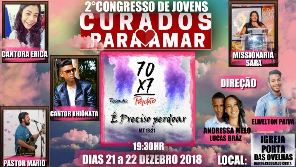 O 2º CONGRESSO DE JOVENS CURADOS PARA AMAR acontecerá em Itapetinga, sudoeste abaiano, no templo da Igreja Evangélica Portas das Ovelhas, localizada na Rua Lindiomar Santana, S/Nº, Clodoaldo Costa, nos dias 21 e 22 de dezembro de 2018.