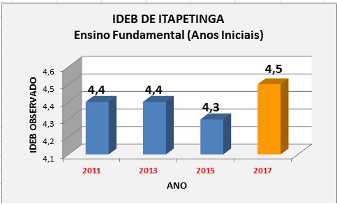 Realizada a apenas oito meses da atual gestão, a avaliação aponta melhorias animadoras. O resultado das séries iniciais do Ensino Fundamental apontam um crescimento de 4,3 em 2015 para 4,5 em 2017. Além disso, as escolas municipais Renato Leite, Clero Pedreira e Dona Geni atingiram a projeção proposta pelo MEC e as escolas Sizaltina Fernandes, Rosalina Vésper e Edirani Pacífico conseguiram resultados acima de 5,0.