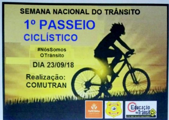 A COMUTRAN (Coordenadoria Municipal de Trânsito de Itapetinga) através do Setor de Educação para o Trânsito (SET), a partir desta quinta-feira, 06, abrirá o período de inscrição do 1º Passeio Ciclístico, a realizar-se no dia 23 de setembro, dentro das atividades da Semana Nacional do Trânsito (de 18 a 25 de setembro).