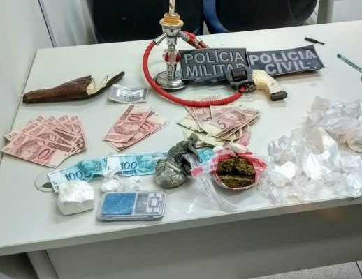 Após localizarem o imóvel os policiais realizaram uma abordagem minuciosa e encontraram 01 (um) revolver calibre .32, fabricação argentina, marca Italo Gra; 196 gramas de substancia análoga a cocaína, 79 gramas de substancia análoga a maconha, 73 cédulas falsas de dinheiro (notas de 5, 10 e 100 reais), uma balança de precisão , um narguilé, uma faca tipo peixeira e sacos (geladinho) diversos para armazenar drogas.