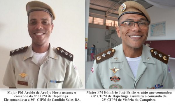 Para o seu lugar está chegando o Major PM Aroldo de Araújo Horta, que comandou a 80ª CIPM de Cândido Sales-BA. O Major PM Edmário Araújo assume o comando da 78ª CIPM, responsável pelo policiamento na Zona Oeste de Vitória da Conquista.