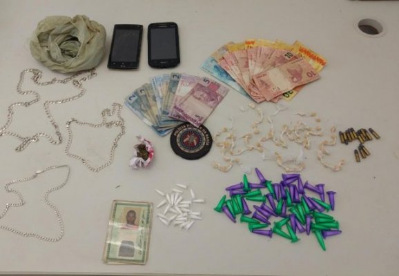 Por volta das 13h de sábado (19) a Polícia Militar recebeu a denúncia que uma casa na Rua Jacinto Silva, bairro Bela Vista (Nova Canaã), estaria ocorrendo tráfico de drogas. Ao chegar no local, com o apoio da guarnição de Iguaí, foi encontrado sob posse de uma adolescente de 15 anos, 52 pinos médios de cocaína, 26 pinos pequenos de cocaína, 74, pedras de crack, Pequena porção de maconha, 13 munições calíbre .22, R$ 378,00 reais em espécie, 03 correntes de prata, 02 celulares e uma motocicleta Honda Fan cor Preta.