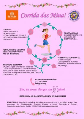 A Guarda Municipal de Itapetinga no próximo dia 11, em homenagem ao mês das mulheres, promoverá a Corrida das Mina. Em um percurso de 6km, na Avenida Cinquentenário, o evento busca oferecer lazer, esporte e, acima de tudo, conscientização e valorização da importância do papel da mulher na sociedade.