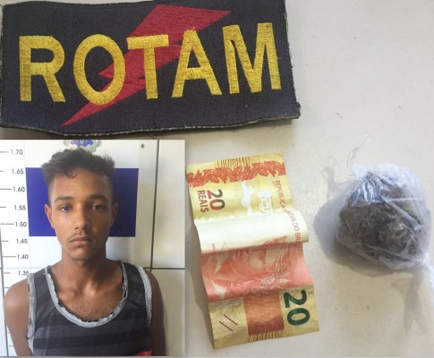 O jovem identificado como Alex Lima Barreto Santos, 18 anos, vulgo "Paulistinha", durante abordagem, estava portando um "dolão de maconha" com 25 gramas, que alegou ter comprado o entorpecente nas margens do Rio Catolé, nas imediações da Estação de Captação do SAAE, na mão de um avião do tráfico.