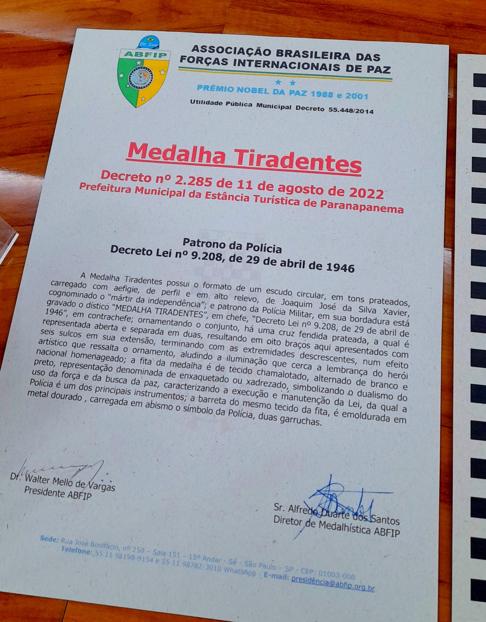 Durante a cerimônia, o diretor regional Akira Campos falou da criação da ABFIP, do trabalho desenvolvido na Bahia pela instituição, fez a leitura do procedimento de outorgas, entrega das medalhas e as condecorações. A outorga destina-se a premiar e reverenciar autoridades civis, militares e eclesiásticas que tenham se destacado em ações humanitárias e manutenção da paz no Brasil ou no exterior.