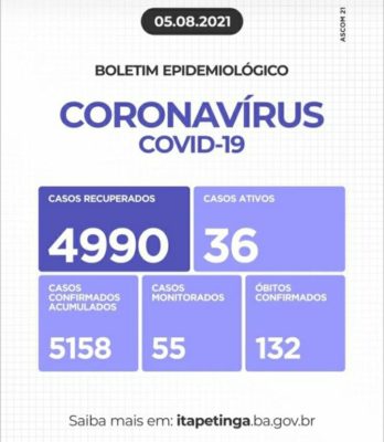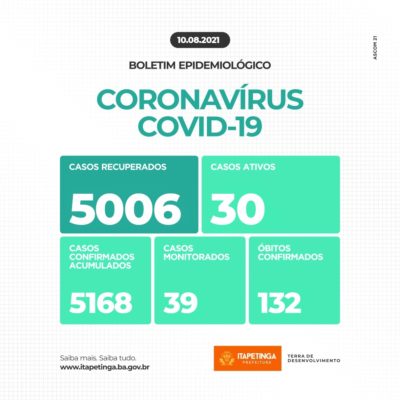 Em Itapetinga, apesar dos 34 Casos Ativos que vêm sendo monitorados pela Vigilância Eídemiológica, o município atingiu neste domingo, 08, a marca de 5.001 Casos Recuperados (São 5.001 Pacientes Infectados pela COVID-19 foram Recuperados da doença desde o início da pandemia). Lamentavelmente morreram 132 pessoas que foram contaminadas e tiveram agravemento do quadro para óbito no mesmo período (desde março de 2020)...
