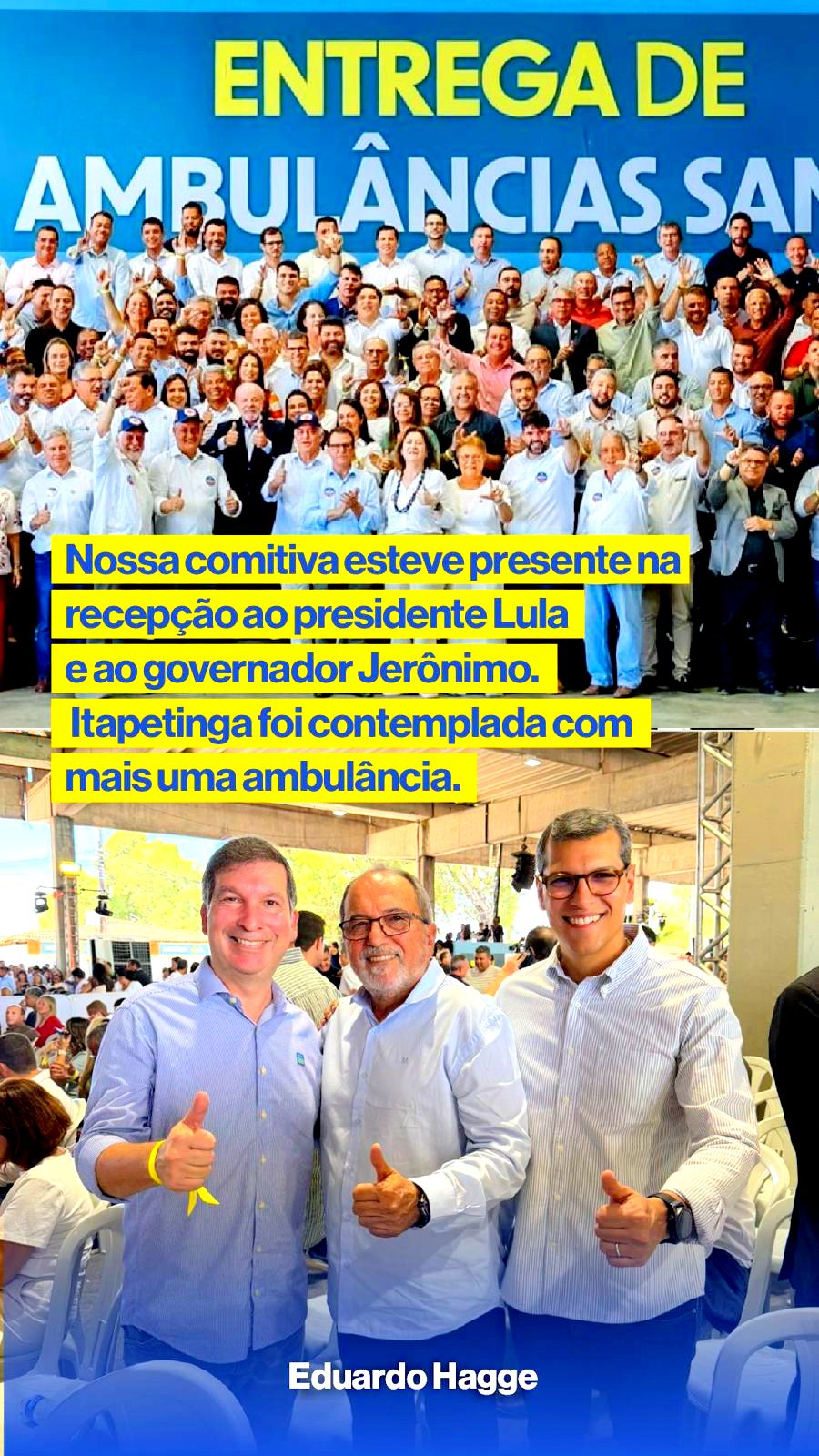 Nesta sexta-feira (6), o gestor de Itapetinga, Eduardo Hagge, esteve presente na solenidade de entrega de equipamentos e serviços do Novo PAC Saúde, apontada como uma das mais amplas ações de aporte financeiro no setor de saúde na história da Bahia. A programação aconteceu no Parque de Exposições, em Salvador, e juntou autoridades nacionais, estaduais e representantes de 76 cidades contempladas.
