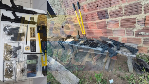 Dentro do imóvel, além das armas de grosso calibre, os agentes encontraram diversas munições, drogas, um alicate amarelo e duas bolsas. As armas são...